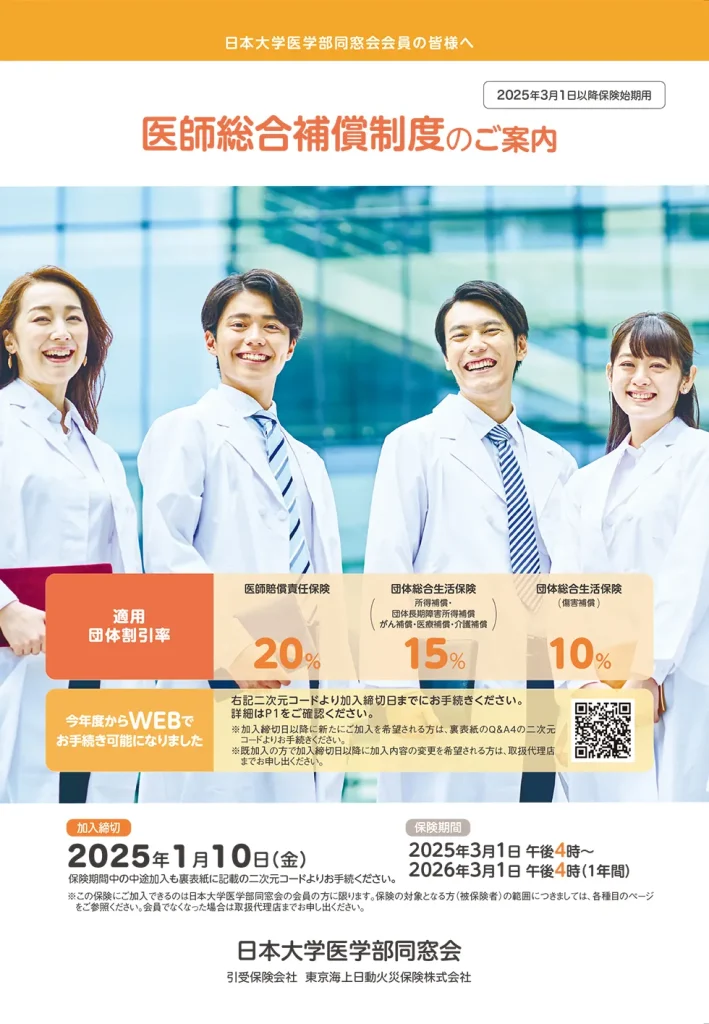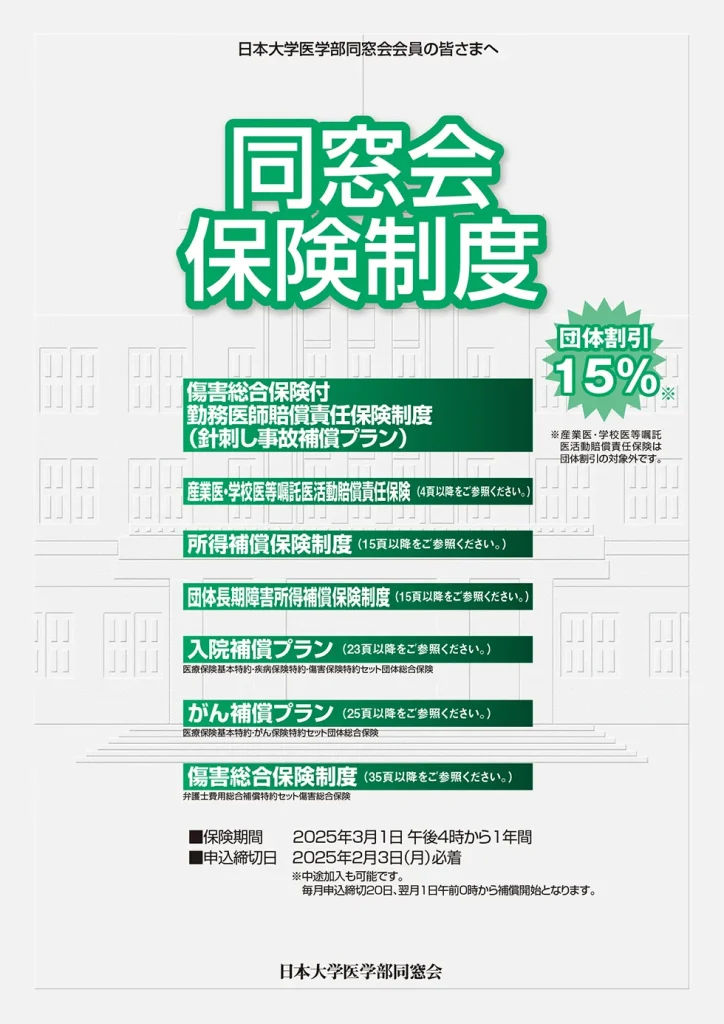 日本大学医学部卒業生およびご家族、その医療機関のための団体保険制度です。
