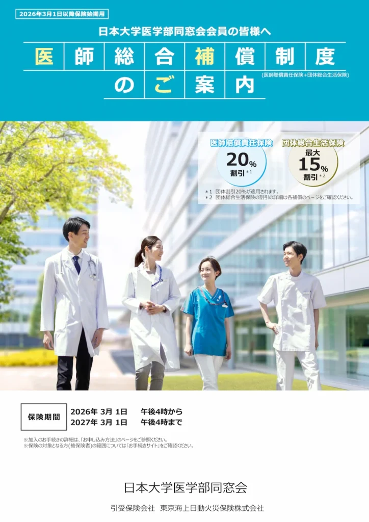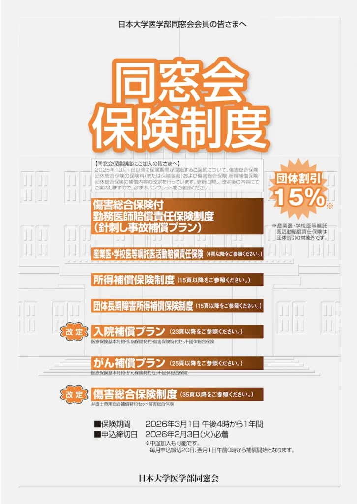 日本大学医学部卒業生およびご家族、その医療機関のための団体保険制度です。